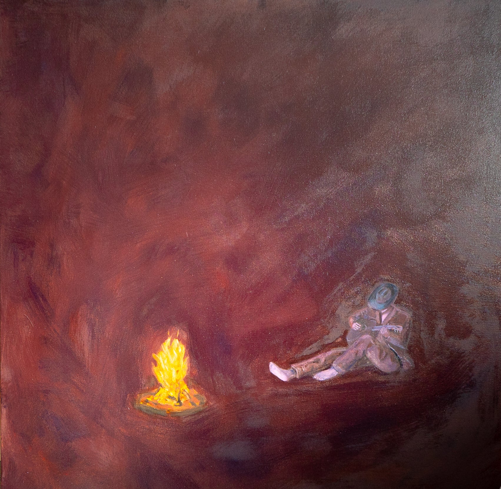 A Vaquero warms his toes by campfire, Gently strumming his guitar.